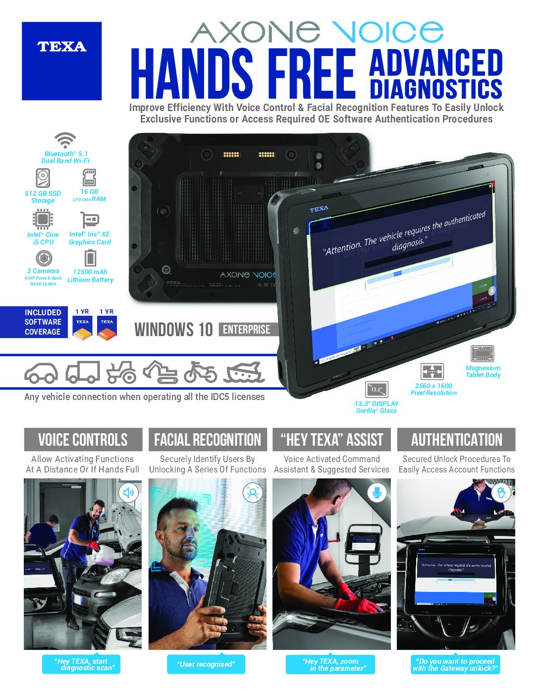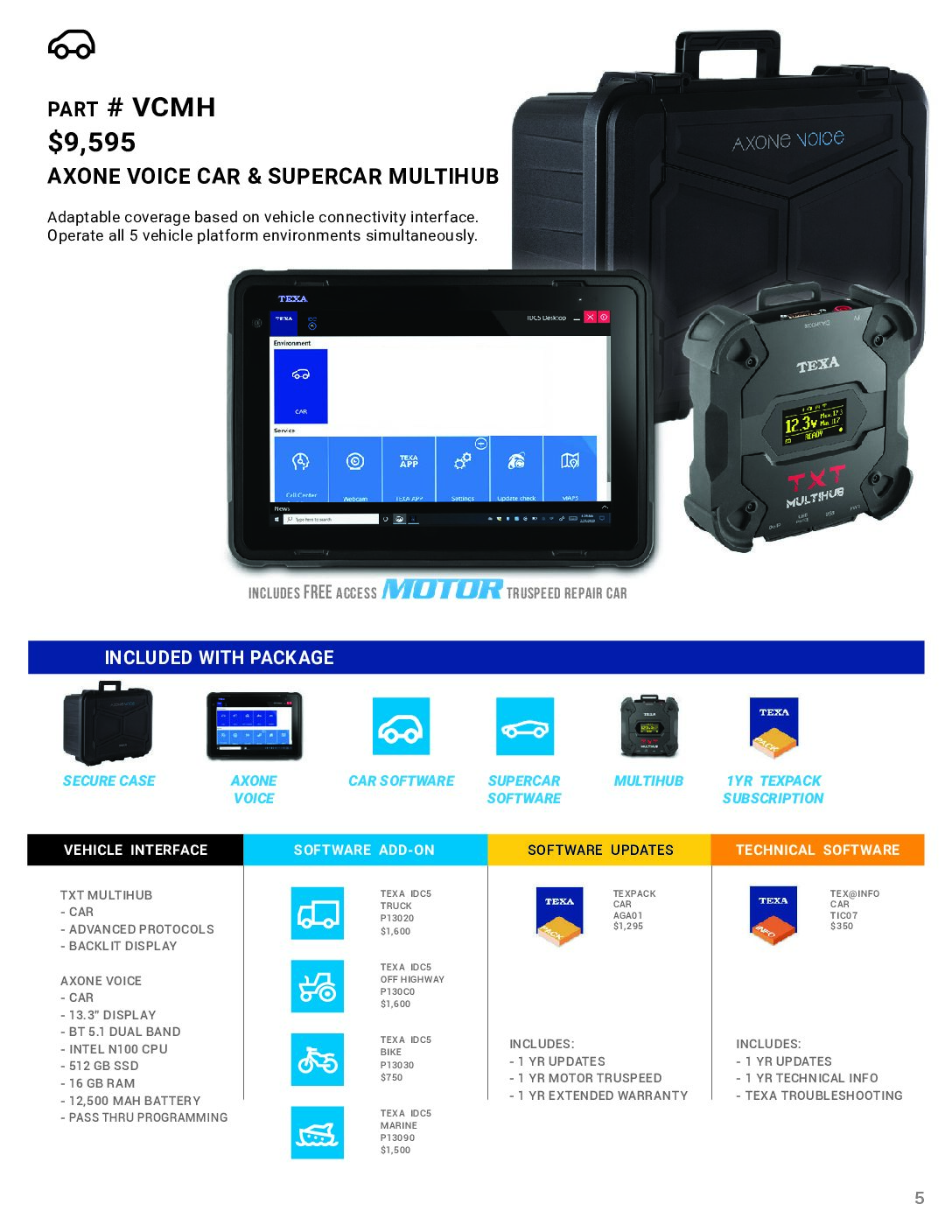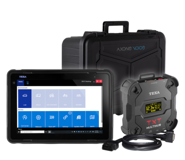 The AXONE VOICE with IDC5 CAR & SUPERCAR software and TXT MULTIHUB Kit provides adaptable coverage based on the vehicle connectivity interface and operates all 5 TEXA vehicle platform environments simultaneously.