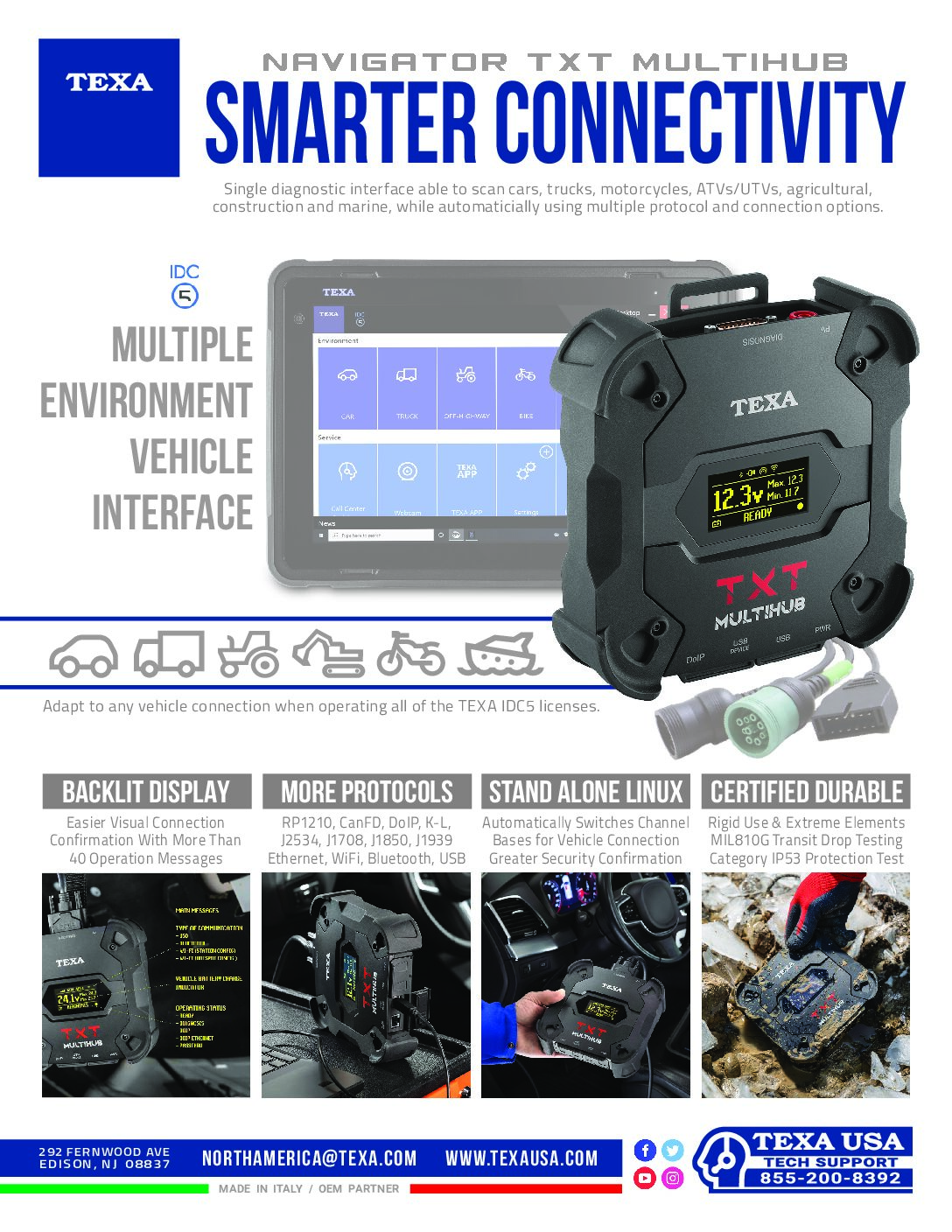 It is a technologically advanced solution with unparalleled technical and constructive features: it can operate all 5 TEXA diagnostic modules, it has a built-in display, it is IP53 certified and can handle the management of DoIP, CAN-FD, J2534/RP1210 protocols and much more.